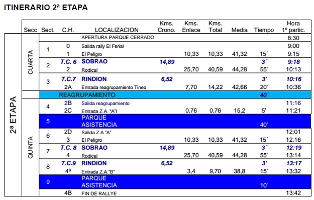 Las especiales de Piedrafita-Rodical y Calleras serán las que conformen la primera etapa desde las 15:58 en que se tomará la salida del primer tramo a las 22:00 horas en que arrancará el último del día, quedando para la mañana del domingo los tramos de Sobrao y Rindión, que se disputarán entre las 9:18 y las 13:17 horas, momentos en los que se iniciarán el primer y último tramo del día.