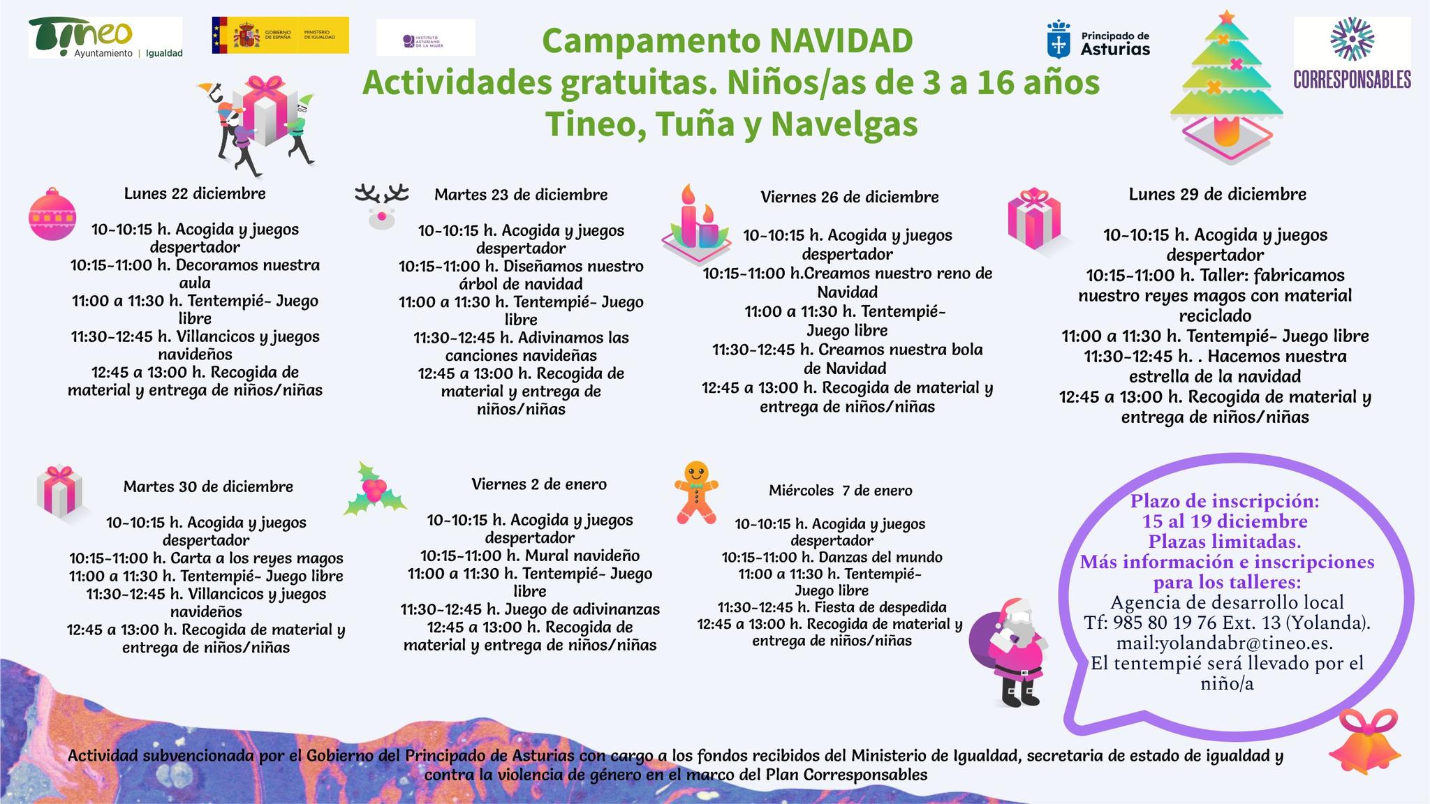La infancia tinetense, con edades comprendidas entre los 3 y los 16 años, disfrutarán de un divertido Campamento de Navidad cuyas propuestas se repartirán por Tineo, Tuña y Navelgas.