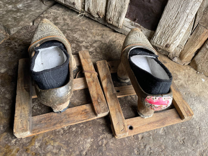 Para su sujeción portan unas correas o cuerdas con las que se atan al tobillo. Como antiguamente no había botas, los ponían con las madreñas.